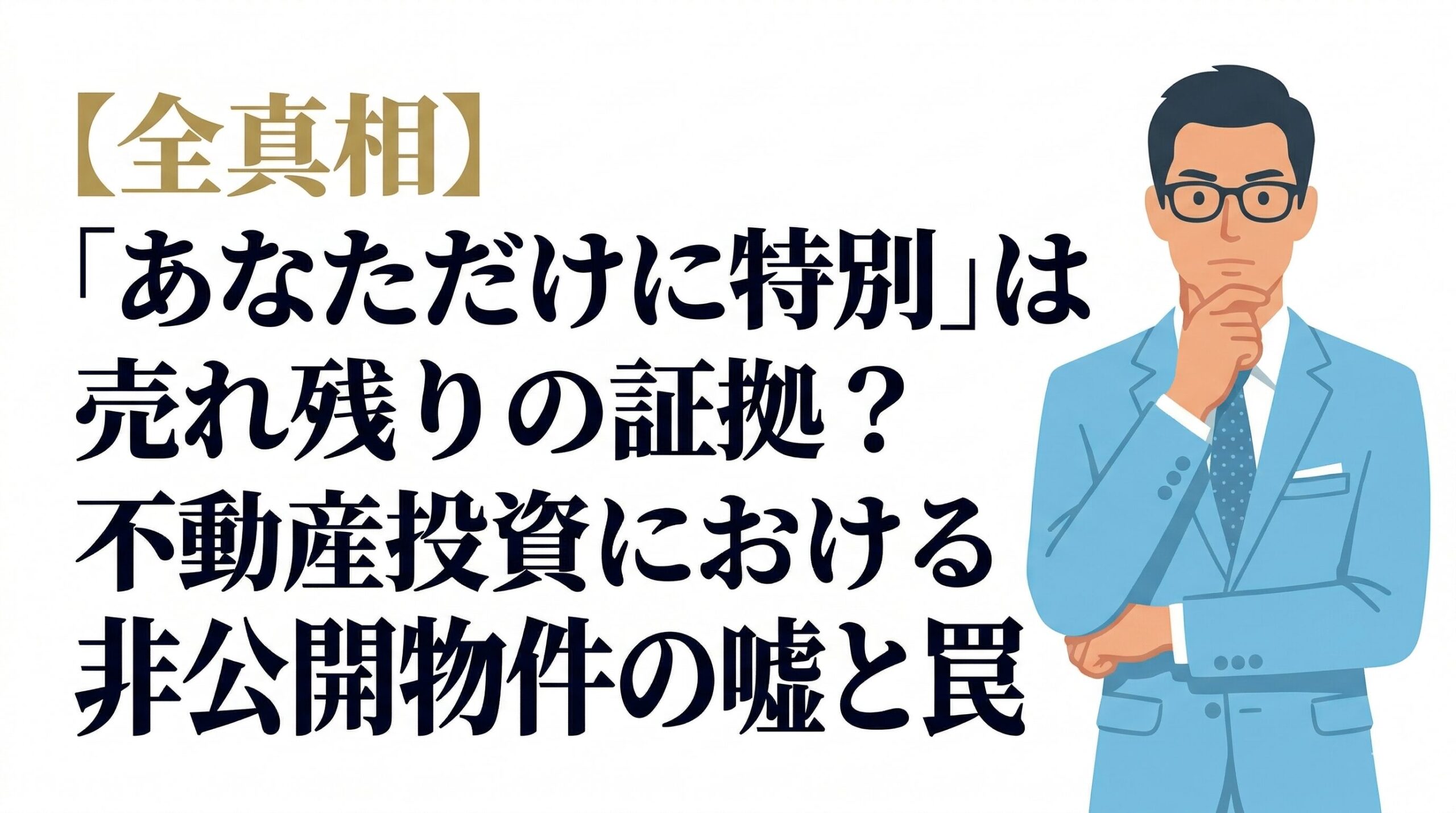 この記事では、不動産投資における「非公開物件」「特別案内」というトークの裏側にある構造的な嘘を、業界の仕組みから論理的に解体します。読み終わる頃には、業者の甘い言葉に対して「冷静に疑う目」が自然と身につくはずです。