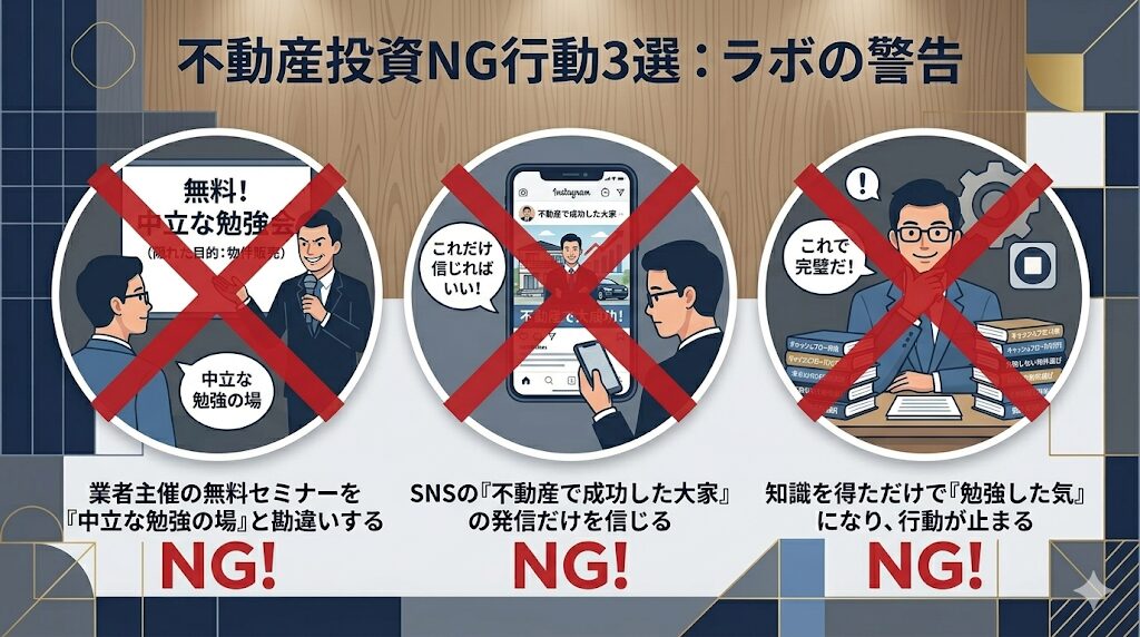 無料セミナーは、知識が十分についてから「業者の営業トークを生で体感する場」として活用するのが正しい使い方です。勉強のためではなく、「敵を知る」ための場として参加する——このマインドセットで臨んでください。