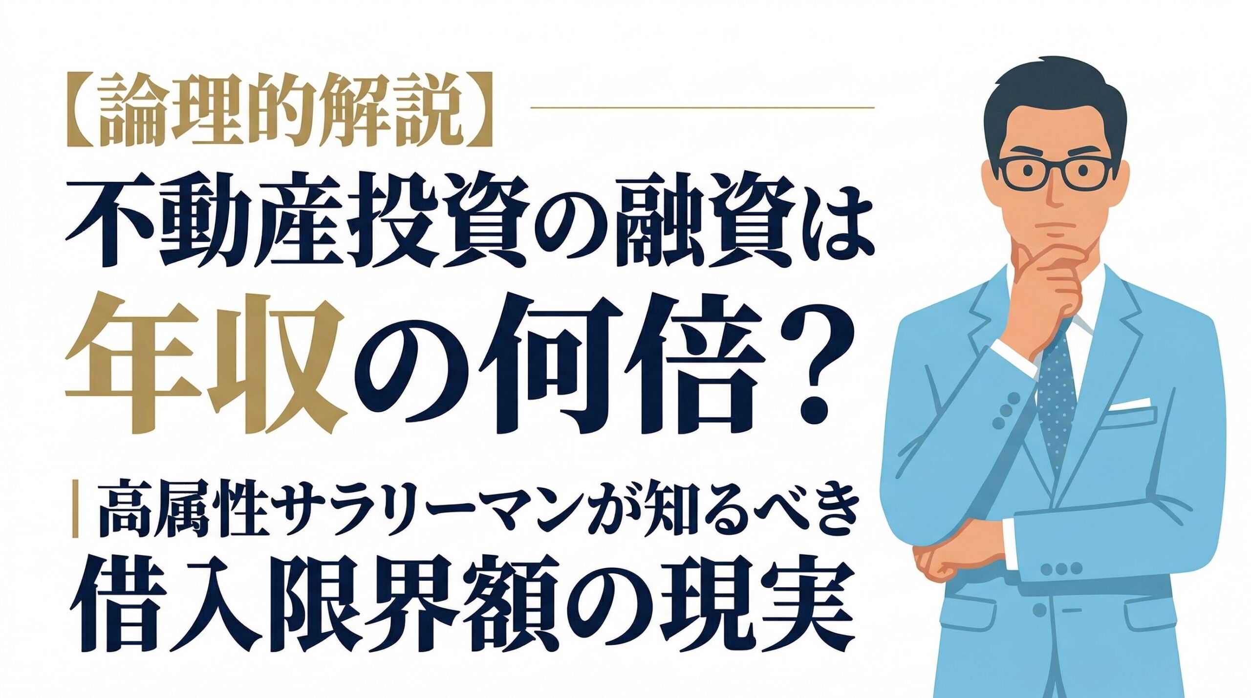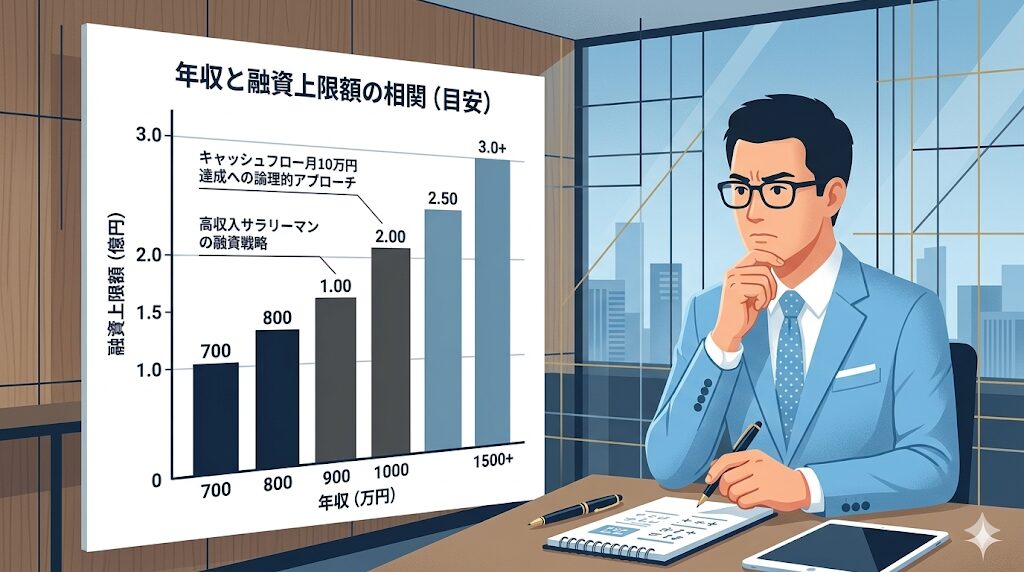 ① 融資の目安は「年収の7〜10倍」だが、それは上限であり保証ではない 年収750万円で2億円の融資が実現できたのは、物件の収益性が銀行基準を満たしていたからです。年収の倍率だけで融資額を語る情報には、必ず疑いの目を向けてください。