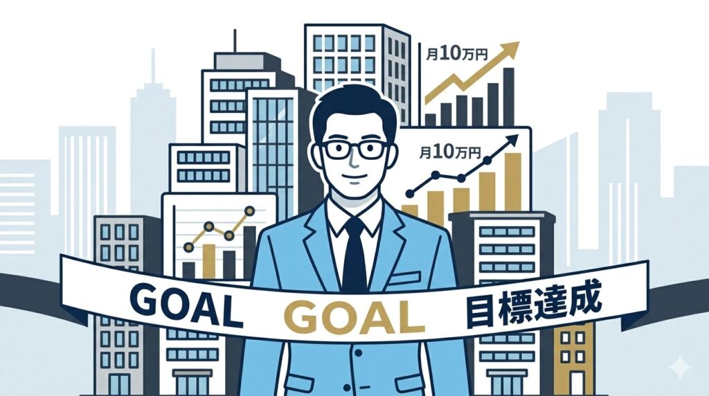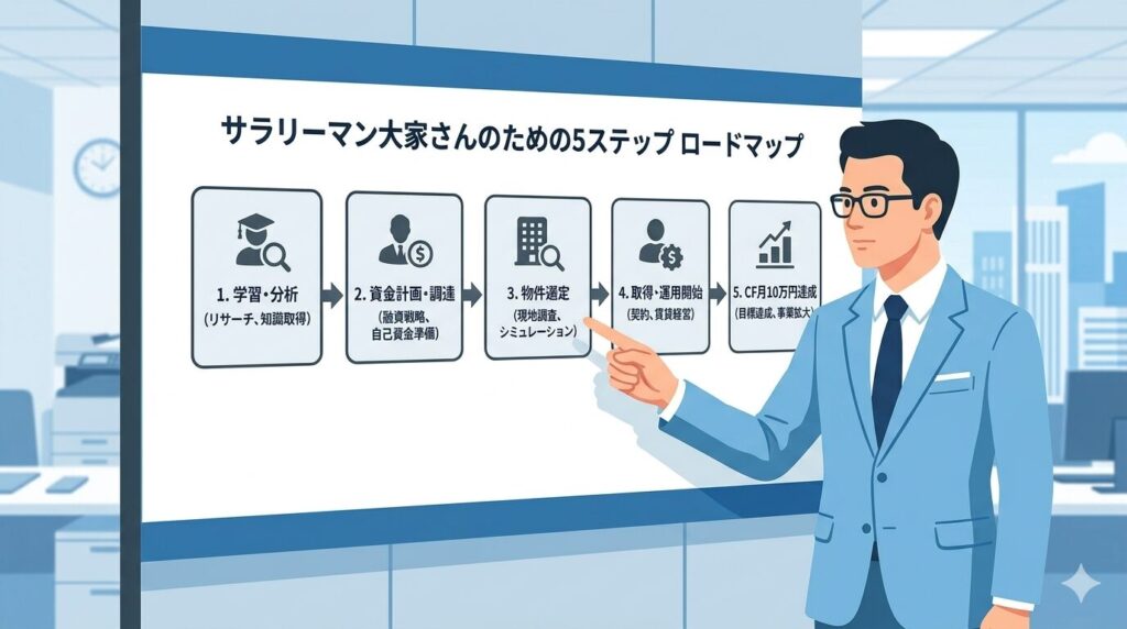 サラリーマンが月10万円のキャッシュフローを安定的に得るまでの道筋を、5つのステップに整理しました。私自身が4棟目・4年目でこの目標を初めて達成したプロセスを、そのままロードマップ化したものです。