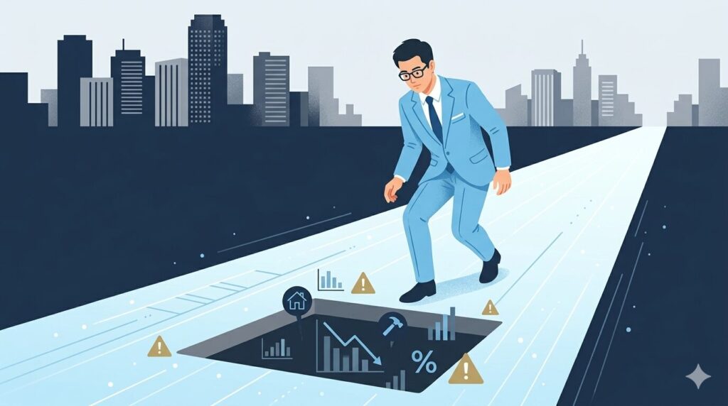 不動産投資で失敗する初心者には、驚くほど共通したパターンがあります。私自身もいくつかの罠に踏み込んだ経験があり、今でも「あのとき正しい知識があれば」と思うことが一つや二つではありません。ここでは、特に多くの人が引っかかる3つの罠を、回避策とともに解説します。