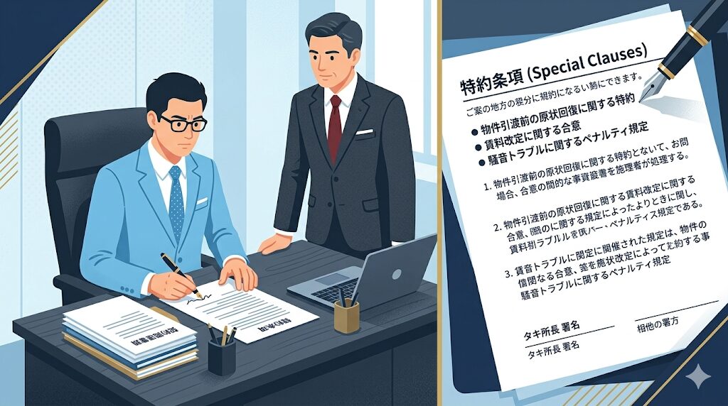 夜逃げ・孤独死どちらのケースでも、事後に最も大家を助けてくれるのが入居時の契約書に盛り込まれた特約です。