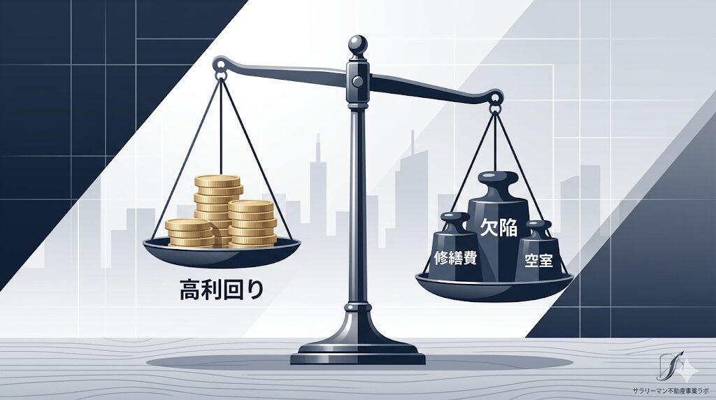 築古物件が高利回りを提示できる理由は、シンプルです。「リスクの高さを利回りという形で価格に織り込んでいる」からです。